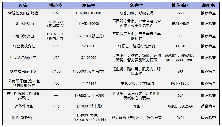 根據(jù)核心推薦意見3,共識(shí)列出了國(guó)內(nèi)幾種常見的推薦及適合納入攜帶者篩查的疾病。其中“推薦篩查”為該疾病建議納入篩查,“適合篩查”為該疾病可考慮選擇納入篩查。